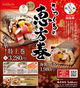 2026-01-30更新 恵方巻きのご予約締切間近です! 2026年今年は南南東です。 2月2日、3日限定 恵方巻きのご予約承り中です! ・豪華!特上海鮮巻 ・海鮮太巻 ・2本ハーフセット(特上と海鮮巻のハーフです) ・2本レギュラーセット(特上と海鮮巻が1本づつです) まもなく受付締め切りますので まだの方は是非、ご注文をお願いたします! ←前の記事 お知らせ一覧へもどる 最新のお知らせ 恵方巻きのご予約締切間近です! 季節の彩り御膳が人気です 過去の記事 2026年1月 2024年6月